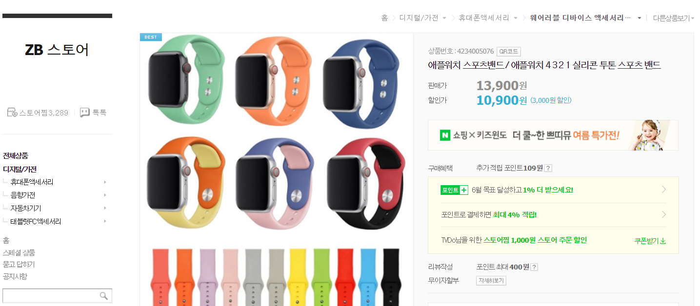 밴드는 스포츠 루프 화이트 색상인데, 회사 생활을 하다보니 새하얀 색상이 많이 거뭇거뭇 해졌습니다. 그래서 새로운 밴드를 사려고 알여보다 애플스토어에 있는 밴드들은 이쁘긴 한데 가격도 상당하더 군요. 그래서 네이버 검색을 통해서 ZB스토어에 있는 실리콘 밴드를 알게 되어 구매하게 되었습니다.